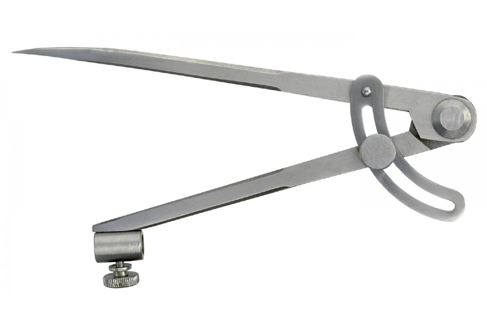 Cyrkiel wykonany ze stali. Ramiona o przekroju prostokątnym. Z zewnętrzną prowadnicą łukową i oprawką do ołówka. Dostarczany