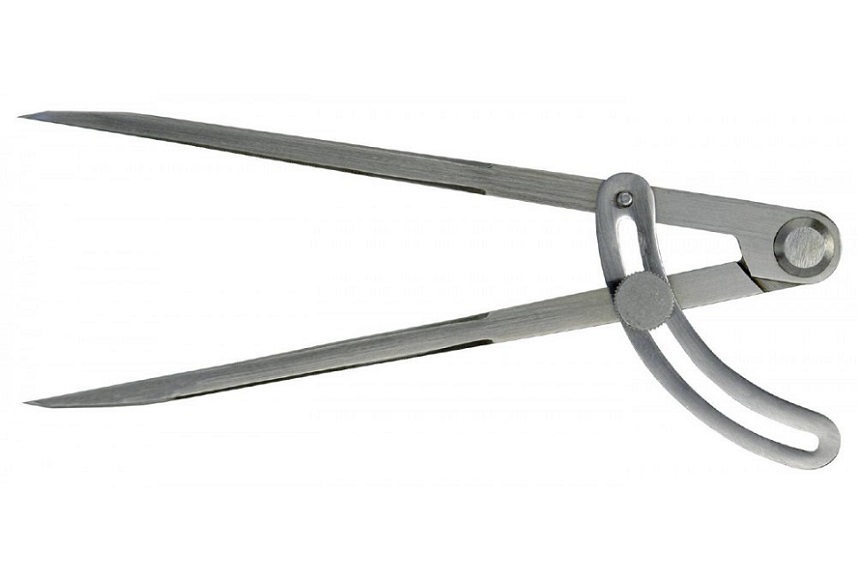 Cyrkiel wykonany ze stali. Ramiona o przekroju prostokątnym. Z ostrymi hartowanymi końcówkami. Zewnętrzna prowadnica łukowa.