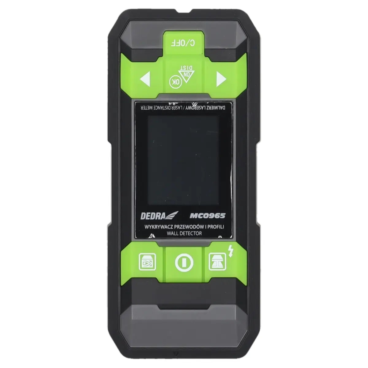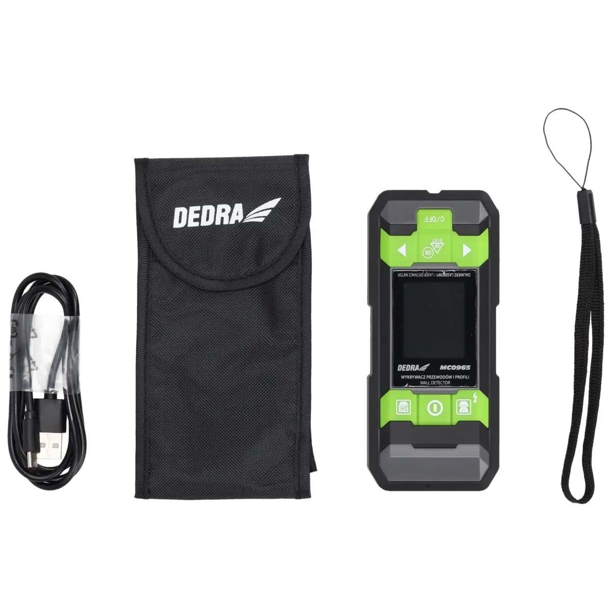 Wykrywacz przewodów i profili DEDRA MC0965 pozwala na wykrycie elementów i profili metalowych, przewodów elektrycznych bez i pod napięciem przemiennym oraz drewna, a także inne przedmioty takie jak żelazo, beton, szkło, aluminium itp.. Pomaga tym samym uzupełnić dokumentację techniczną budynków. Dodatkowo wykrywacz został wyposażony w funkcję dalmierza o zasięgu pracy 0,05-40m, co jest dużym udogodnieniem, gdyż zamiast dwóch urządzeń, mamy jedno