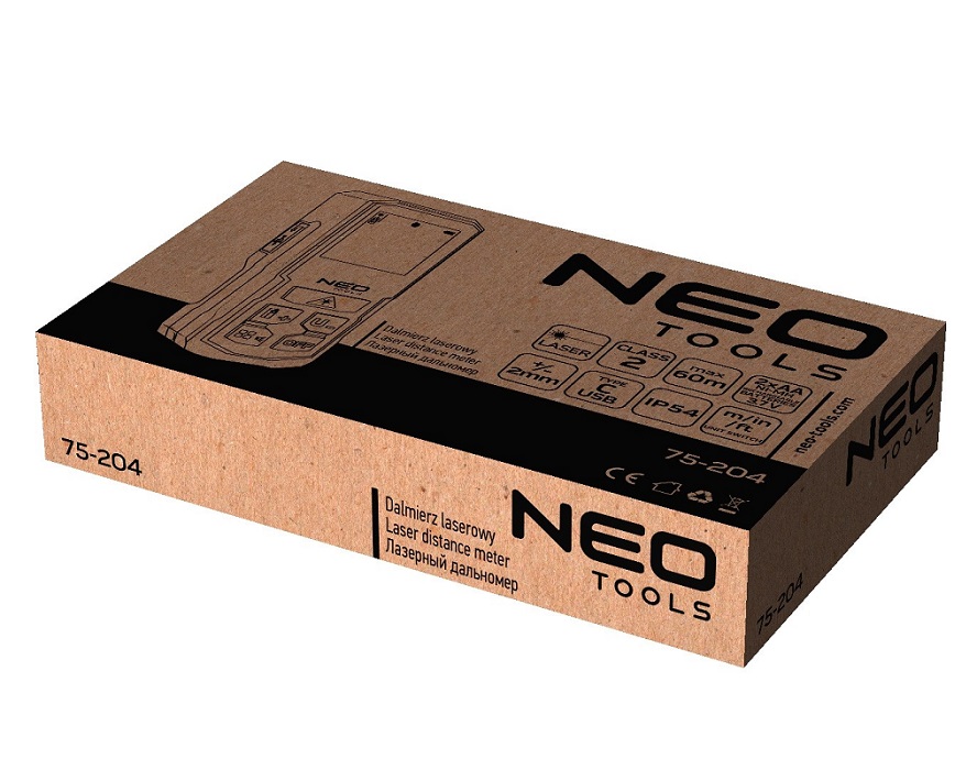 Dalmierz laserowy NEO (nr ref. 75-204) o zasięgu maksymalnym 60 m to urządzenie służące do pomiaru odległości, pola powierzchni oraz objętości.