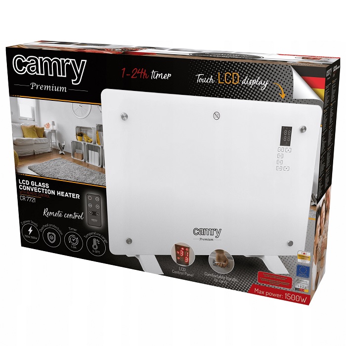 Grzejnik konwektorowy CR7721 to urządzenie dla klientów poszukujących produktów estetycznych i o nowoczesnym wzornictwie. Posiada czytelny wyświetlacz LCD wskazujący aktualną temperaturę w pomieszczeniu oraz dotykowy panel sterowania. Dwustopniowa moc grzewcza pozwala dostosować temperaturę grzania do własnych potrzeb. 24-godzinny timer pozwala ustawić opóźnienie zatrzymania: okres czasu, w którym urządzenie automatycznie się wyłączy. Urządzenie posiada szeroki zakres oczekiwanej regulacji temperatury: 5-35°C. Grzejnik wyposażony jest w pilota ułatwiający obsługę oraz w poręczny uchwyt do przenoszenia.