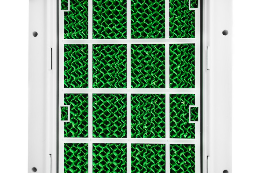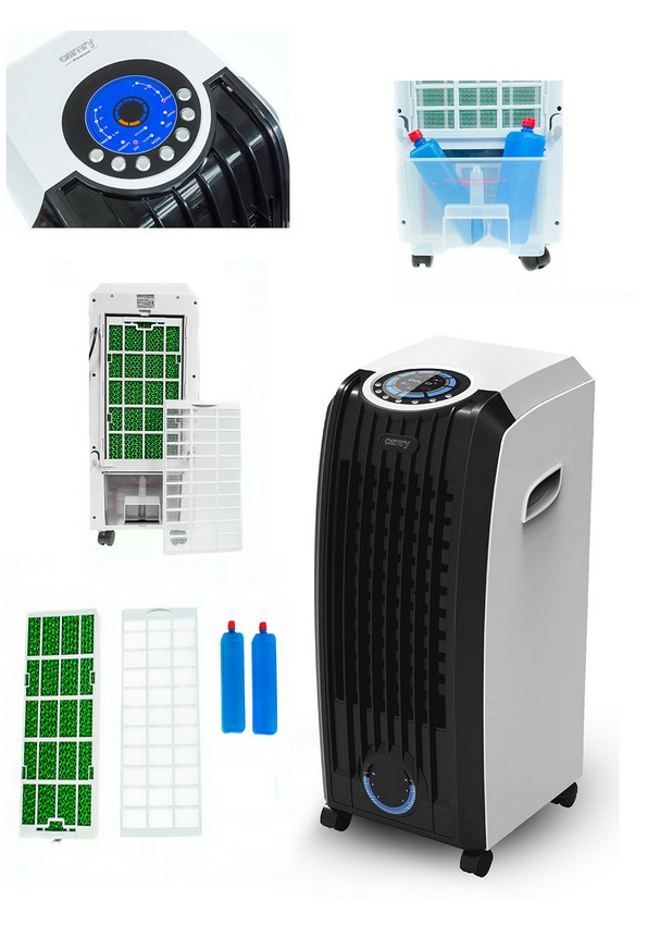 Klimator wyposażony jest w wygodny uchwyt do przenoszenia urządzenia (z obu stron), uchwyt na przewód zasilający, kółka ułatwiające przesuwanie po każdej powierzchni oraz siatkę filtrującej o wysokiej jakości wykonania. W zestawie znajdują się też dwa elementy chłodzące, które po włożeniu do zbiornika z wodą pozwolą na szybkie schłodzenie powietrza. Intuicyjny panel sterowania ułatwia wybór odpowiedniego trybu pracy. Wystarczy wcisnąć przycisk HUMIDIFY, aby obniżyć temperaturę wydmuchiwanego powietrza poprzez uruchomienie pompy wody. Klimator wyposażony jest także w timer, który pozwala zaprogramować ile czasu będzie pracowało urządzenie, zanim samo się wyłączy (od 0.5h do 7.5h). Do zestawu dołączony jest także pilot na 2 baterie (AAA).