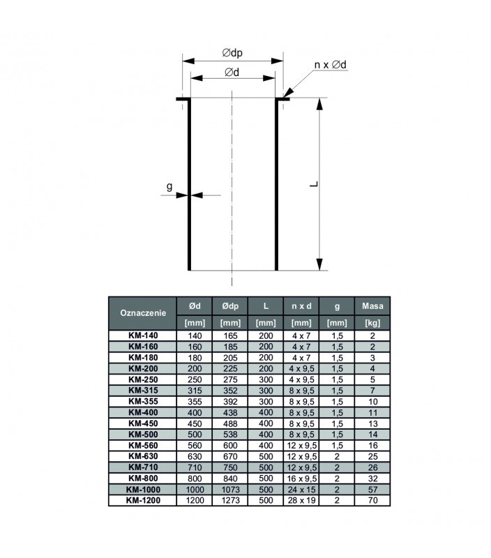 Króćce KM składają się z rury z przyspawanym kołnierzem montażowym. Całość wykonana z blachy stalowej pokrytej poliestrem metodą piecową.