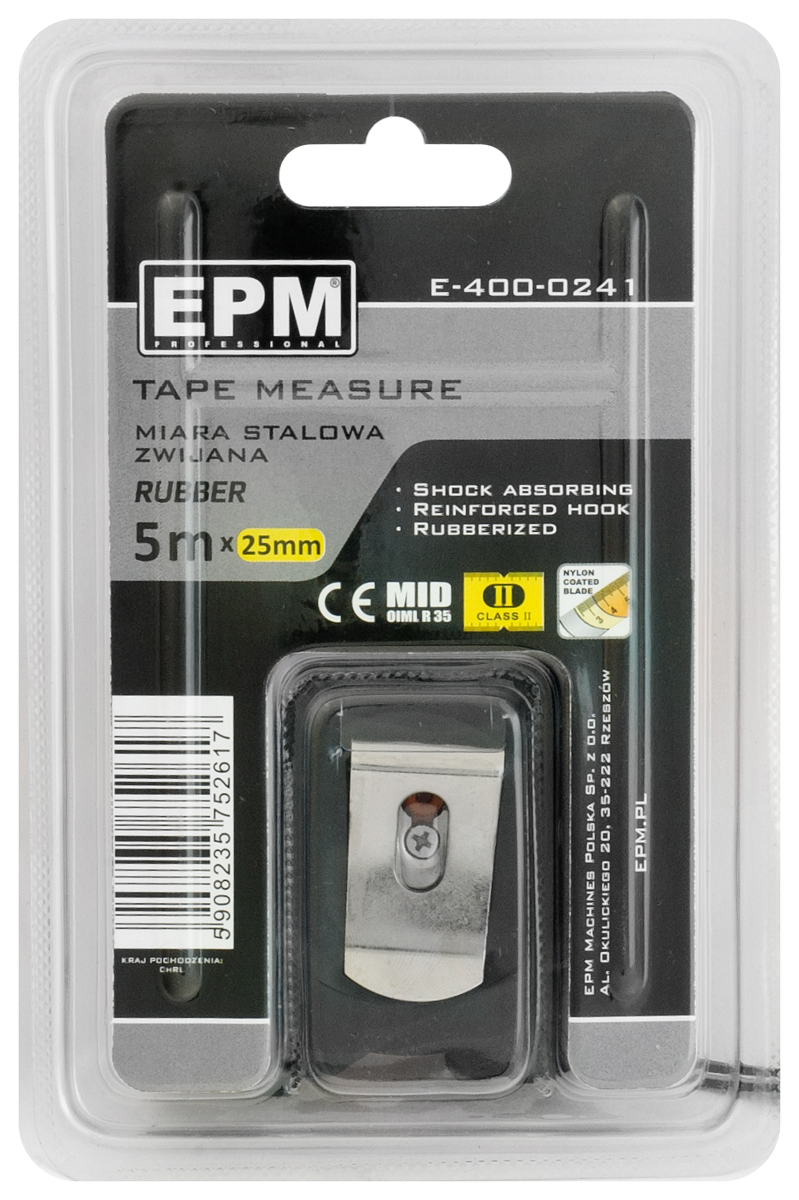 Taśma stalowa pokryta nylonem – Obudowa wykonana tworzywa sztucznego – Gumowa, antypoślizgowa osłona obudowy – Odporna na wstrząsy – Wzmocniony zaczep mierniczy zabezpieczony 3 nitami – Praktyczny zaczep do paska oraz gumowy uchwyt – Funkcja STOP – Dwa praktyczne hamulce – 25 mm szerokość taśmy
