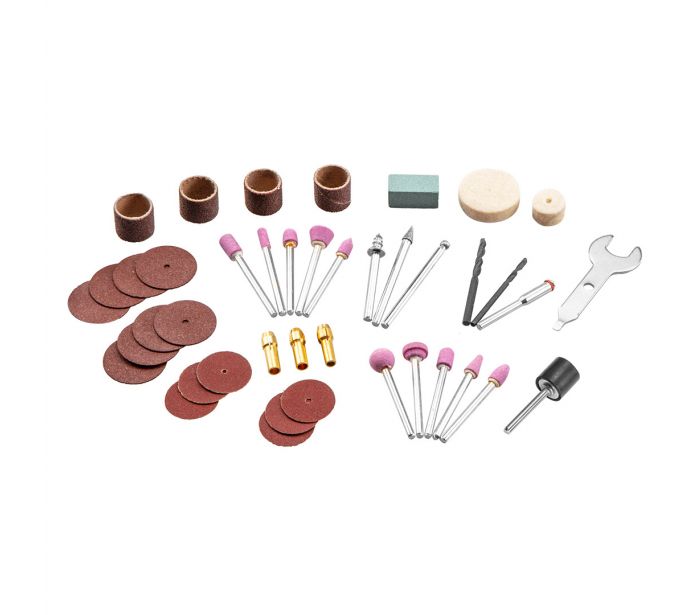 Dostarczana w praktycznej walizce z tworzywa sztucznego wraz z bogatym zestawem akcesoriów, takich jak kamienie szlifierskie, frezy diamentowe, wiertła, osełka, filce polerskie, głowica i taśmy do szlifowania oraz tarcze tnące.