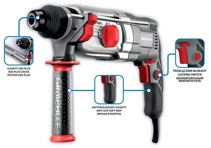 Młotowiertarka SDS+ 900 W, 3,4J, walizka 58G539 marki GRAPHITE to specjalistyczne narzędzie SDS+ o mocy 900 W, posiadające funkcje wiercenia oraz wiercenia z udarem pneumatycznym. Umożliwia wykonanie otworów do 28 mm średnicy w betonie i cegle, 13 mm w stali oraz 30 mm w drewnie. Narzędzie posiada funkcje zmiany kierunku obrotu wrzeciona, stopniowej regulacji prędkości i blokadę włącznika do pracy ciągłej. Podczas wiercenia młotowiertarka osiąga do 950 obrotów na minutę, a po przełączeniu na udar (funkcja udaru uruchamia się w trakcie docisku wiertła do powierzchni wierconej) – do 5300 uderzeń na minutę. Energia udaru w narzędziu wynosi 3,4 J. Wygodna funkcja ,,click” przeznaczona jest do szybkiego mocowania wiertła. Komfortowa rękojeść główna narzędzia pokryta jest antypoślizgową nakładką, dobrze więc leży w dłoni. W zestawie znajdują się: dodatkowe wiertła, uchwyt wiertarski, adapter do uchwytu, listwa ogranicznika głębokości wiercenia, obrotowa rękojeść dodatkowa, zasobnik ze smarem oraz walizka tra