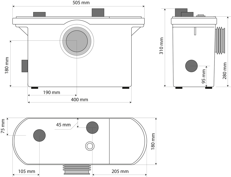 • możliwość podłączenia dwóch dodatkowych urządzeń, np. zmywarki, zlewu, bidetu, pralki, a nawet niskiego brodzika lub wanny