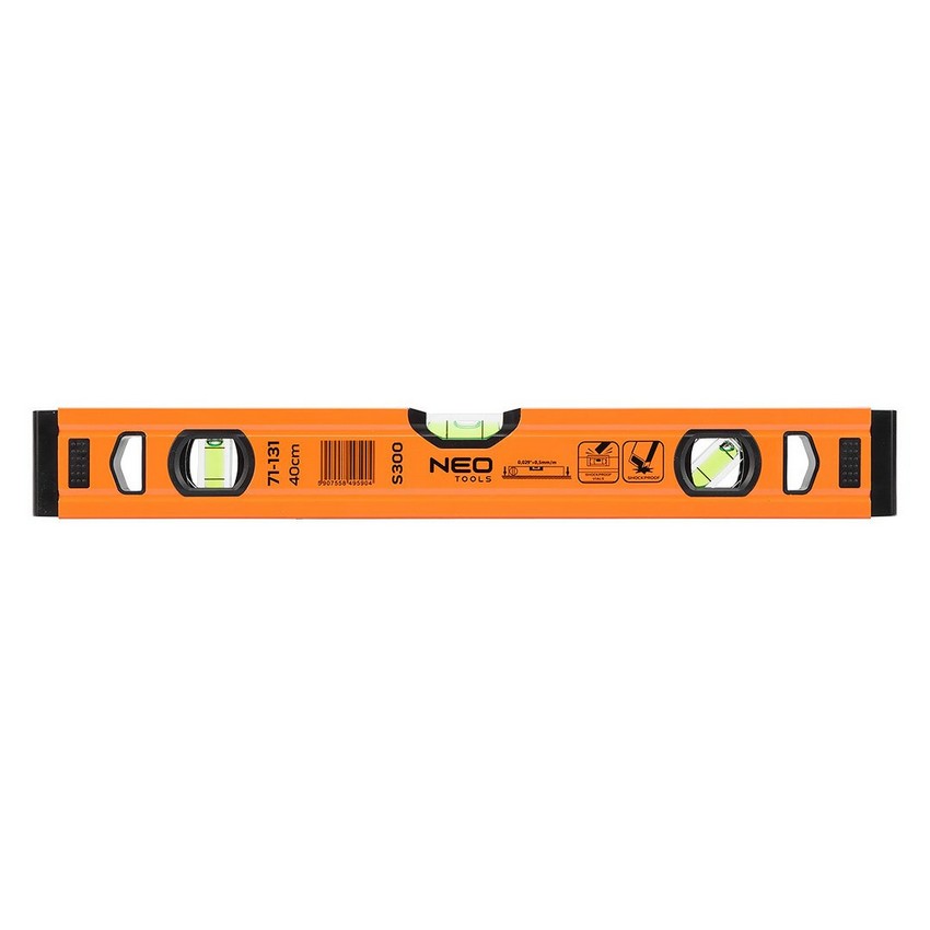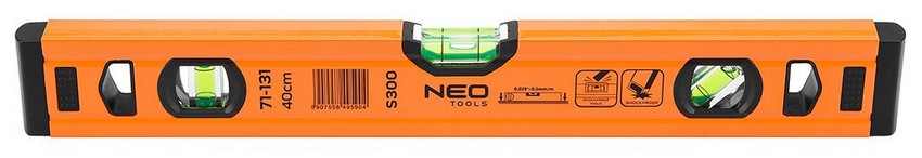 Poziomnica aluminiowa S 300, 3 libelle, 40 cm 71-131 marki NEO to wysokiej klasy przyrząd pomiary z wbudowanymi trzema libellami rurkowymi (45, 90 i 180 stopni), wykorzystującymi siłę grawitacji ziemskiej do wyznaczania poziomości lub pionowości płaszczyzn w budownictwie. Oferowany model charakteryzuje się wymiarami 51,5×20,5×400 mm. Posiada grubość profilu 1 mm oraz gęstość 0,395 kg/m. Dokładność poziomnicy określa się na poziomie 0.029°=0.5 mm/m. Narzędzie zostało wykonane z aluminium. Konstrukcja wyposażona jest w 2 nasadki antywstrząsowe. Polecane profesjonalistom oraz majsterkowiczom.