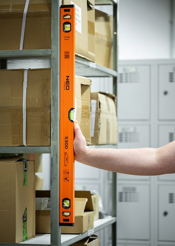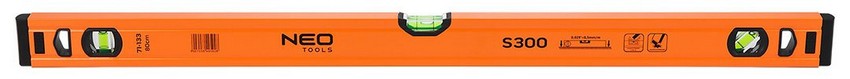 Poziomnica aluminiowa S 300, 3 libelle, 80 cm 71-133 marki NEO to wysokiej klasy przyrząd pomiary z wbudowanymi trzema libellami rurkowymi (45, 90 i 180 stopni), wykorzystującymi siłę grawitacji ziemskiej do wyznaczania poziomości lub pionowości płaszczyzn w budownictwie. Oferowany model charakteryzuje się wymiarami 51,5×20,5×800 mm. Posiada grubość profilu 1 mm oraz gęstość 0,395 kg/m. Dokładność poziomnicy określa się na poziomie 0.029°=0.5 mm/m. Narzędzie zostało wykonane z aluminium. Konstrukcja wyposażona jest w 2 nasadki antywstrząsowe. Polecane profesjonalistom oraz majsterkowiczom.