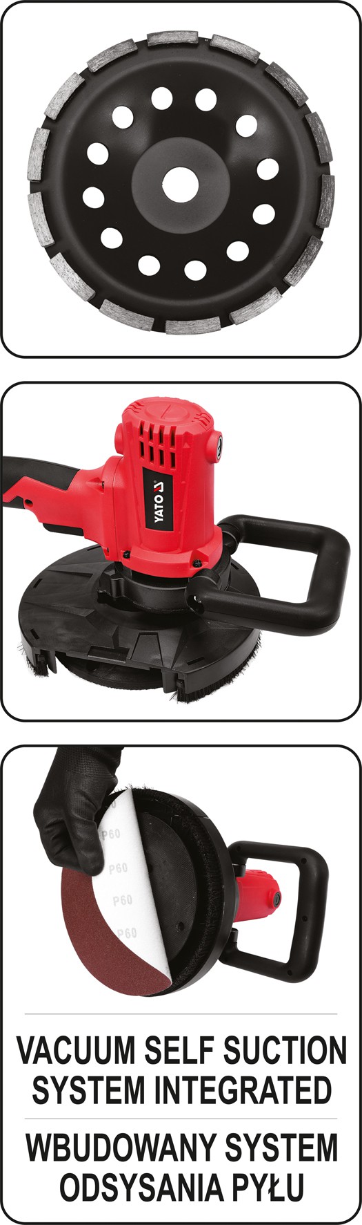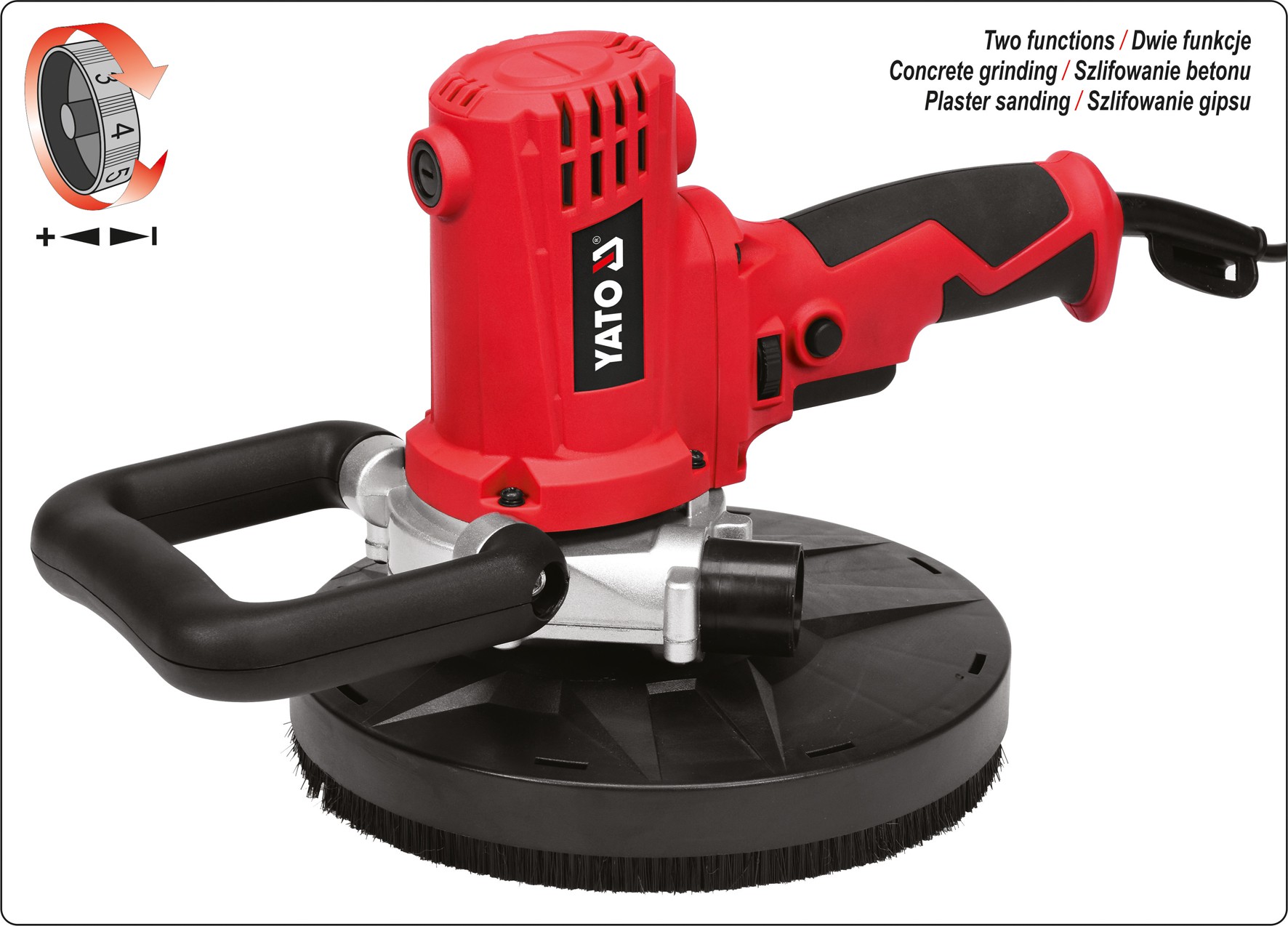 Kompaktowa szlifierka przeznaczona do szlifowania dużych, płaskich powierzchni betonowych (tarczą diamentową 180 mm) oraz gładzi i tynków (za pomocą tarczy z rzepem).