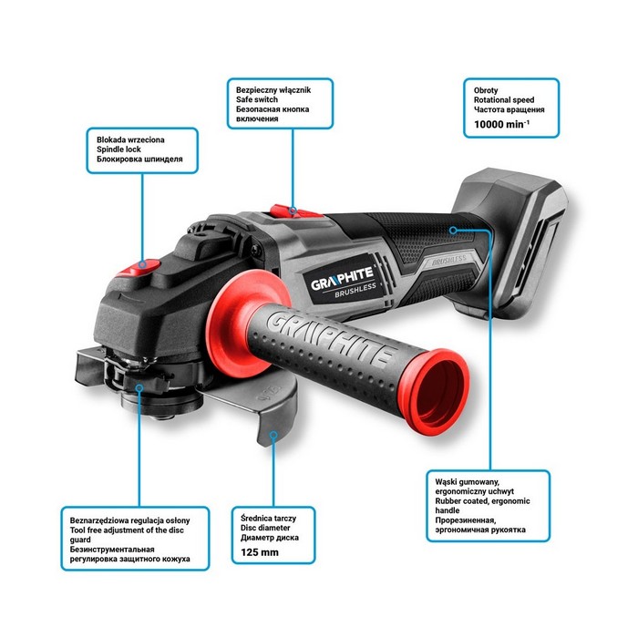 Szlifierka kątowa GRAPHITE, współpracująca z akumulatorami 18V Li-Ion GRAPHITE Energy+.