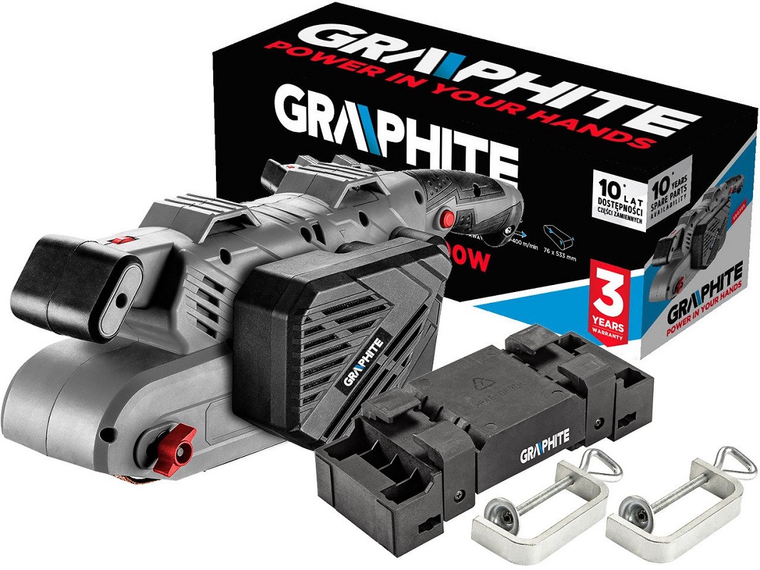 Specjalistyczna szlifierka taśmowa GRAPHITE o mocy 900W, przeznaczona do obróbki materiałów drewnianych oraz drewnopodobnych, metalu i tworzyw sztucznych.