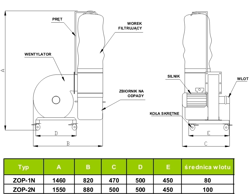Wirnik stalowy, w skład urządzenia wchodzi pojemnik na zanieczyszczenia oraz worek filtrujący.