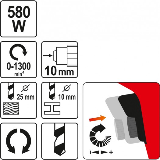 Posiada możliwość zmiany kierunku obrotów lewo-prawo, bezstopniową regulację prędkości obrotowej oraz bezkluczykowy uchwyt mocujący 10 mm.