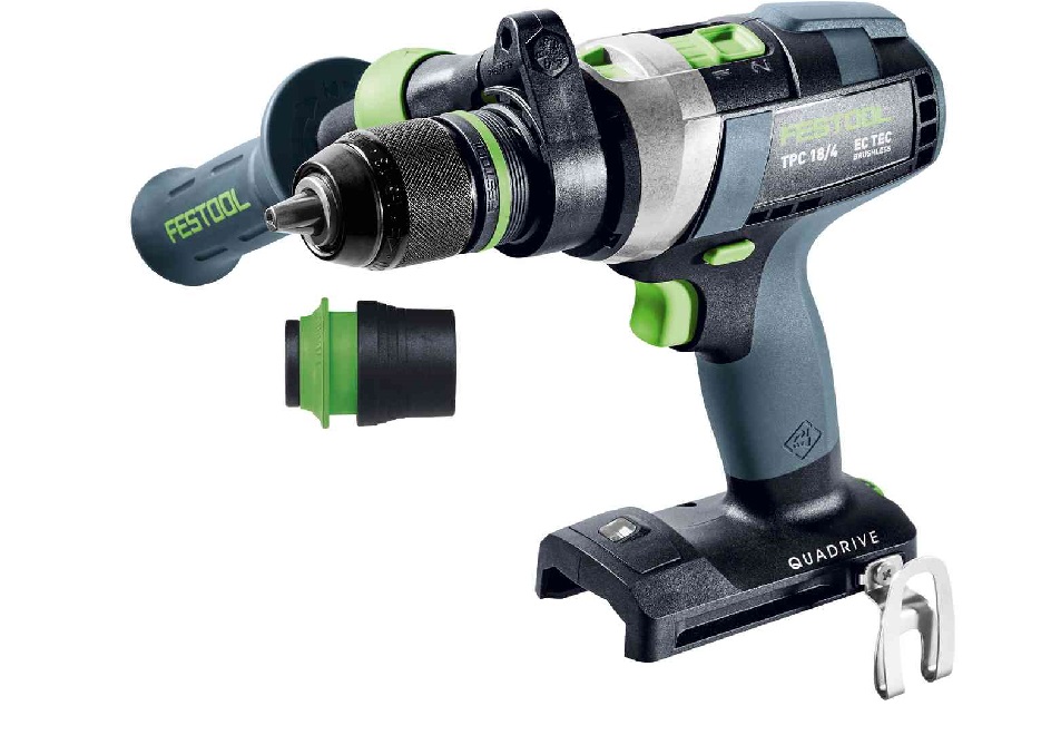 Taka powinna być wiertarko-wkrętarka akumulatorowa. Siła. Wszechstronność. 4 biegi do różnych zastosowań. Najlepsza koncepcja zmiany biegów, jaką widziałeś. Czy to w drewnie, czy w metalu, czy w murze z włączanym udarem osiowym, TPC jest niezwykle wytrzymała, a dzięki bezszczotkowemu silnikowi EC-TEC posiada ogromną moc i trwałość. Liczne nasadki w połączeniu z perfekcyjnie dobranym wyposażeniem sprawiają, że QUADRIVE jest niezrównaną wiertarko-wkrętarką udarową o szerokim zakresie zastosowań. Niebezpieczne skręcenie nadgarstka w przypadku nagłego zablokowania narzędzia? Nasze inteligentne zabezpieczenie KickbackStop minimalizuje ryzyko wystąpienia tego zjawiska. Wypróbuj najlepszą wiertarko-wkrętarkę udarową, jaką dotąd zbudował Festool!