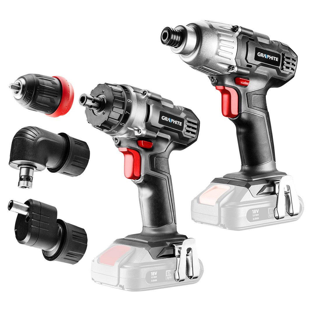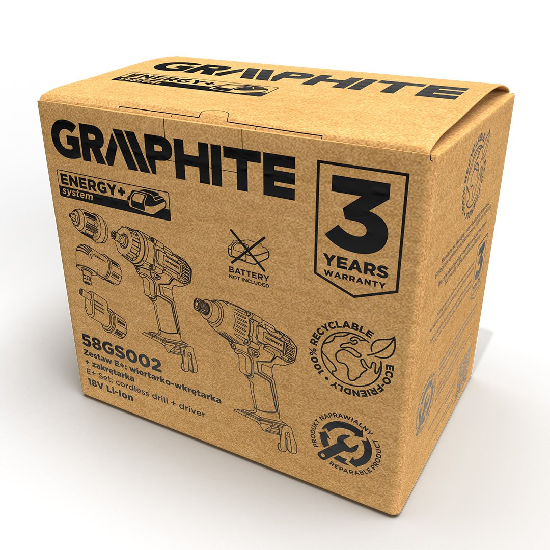 Zestaw E+: wiertarko-wkrętarka 58G022-AD z zakrętarką 58G012, 58GS002 marki GRAPHITE to zestaw 2 w 1 składający się na wiertarko-wkrętarke GRAPHITE Energy+ z adapterami (nr ref. 58G022-AD) i zakrętarkę 58G012.